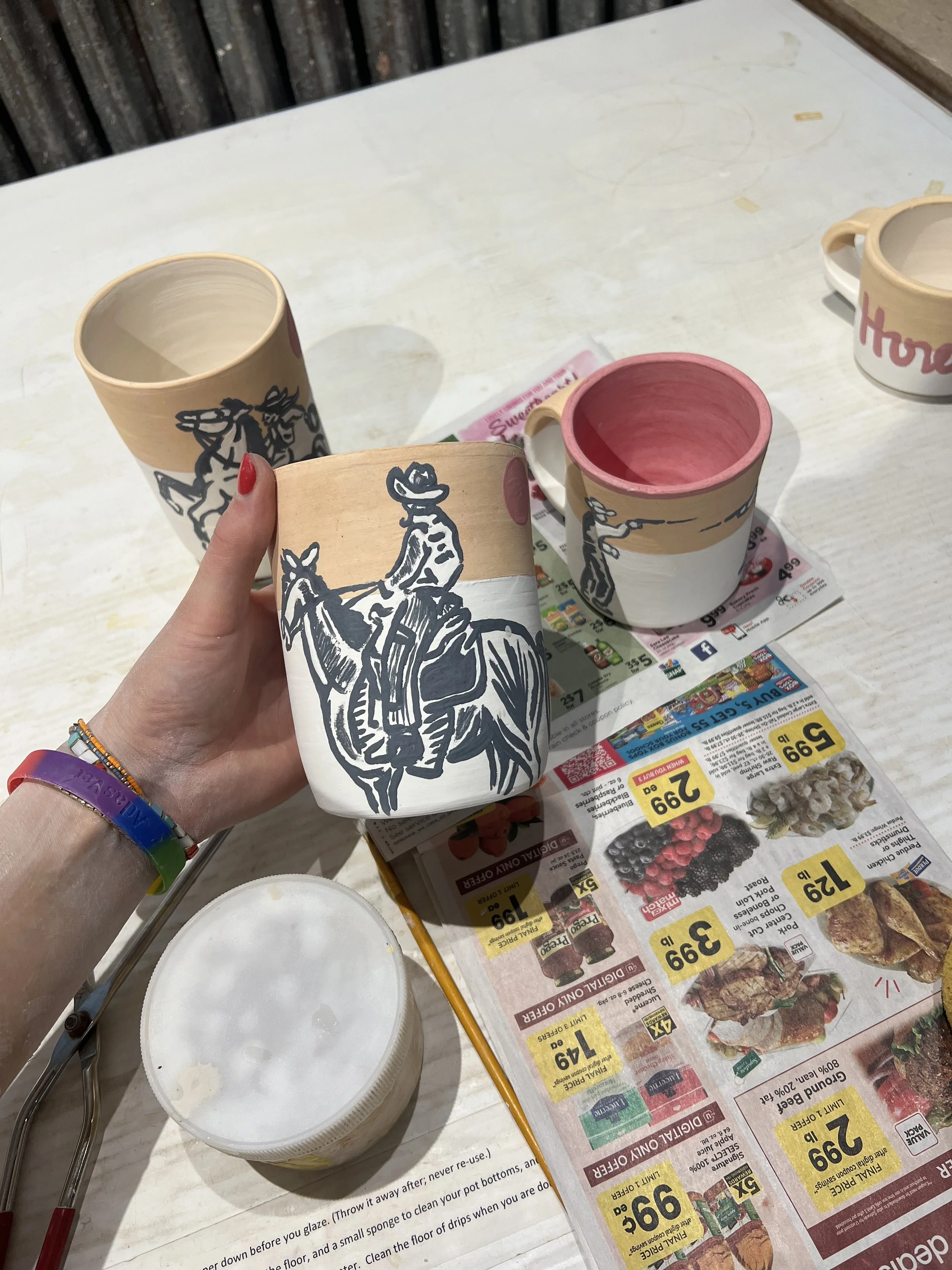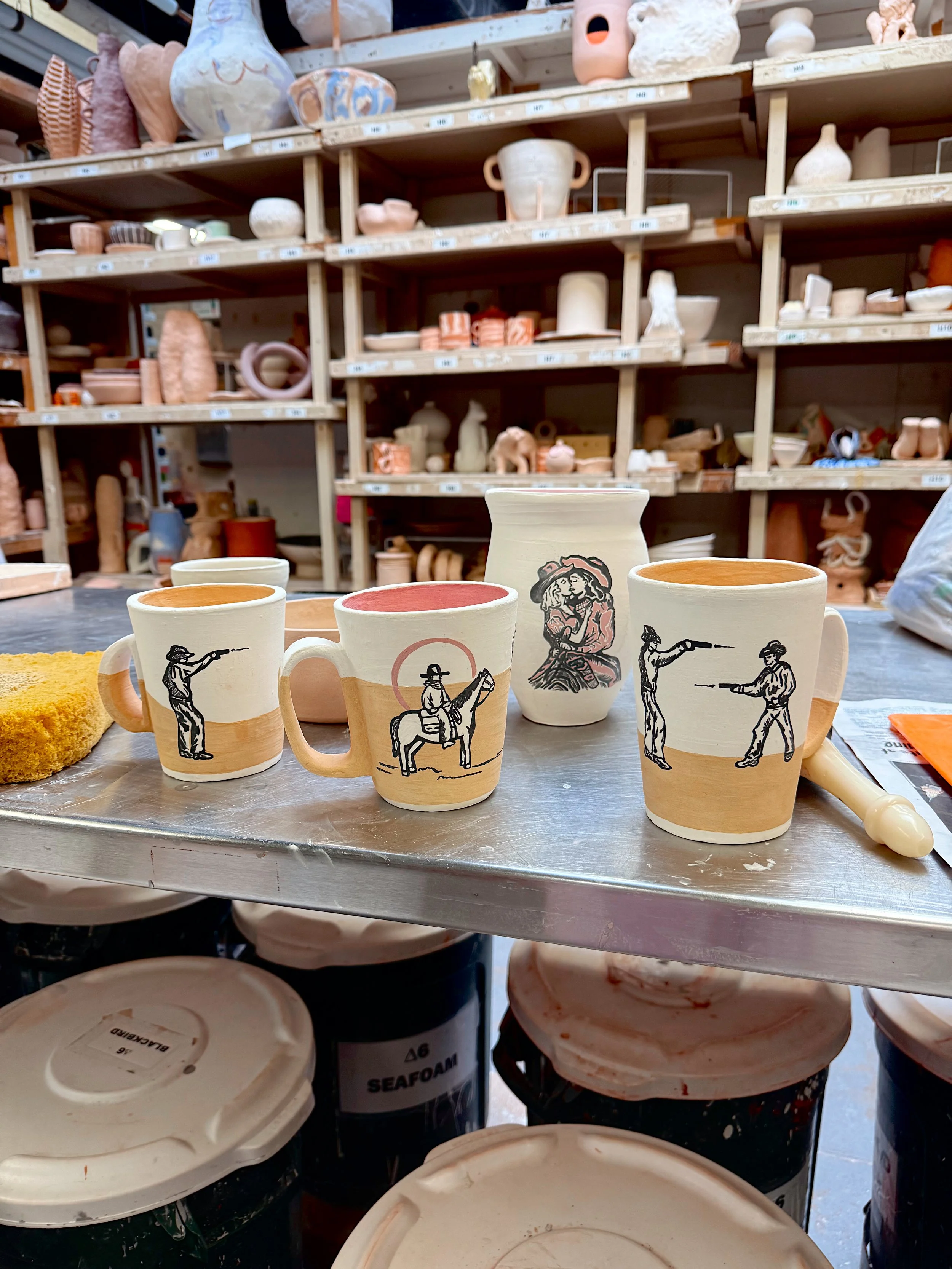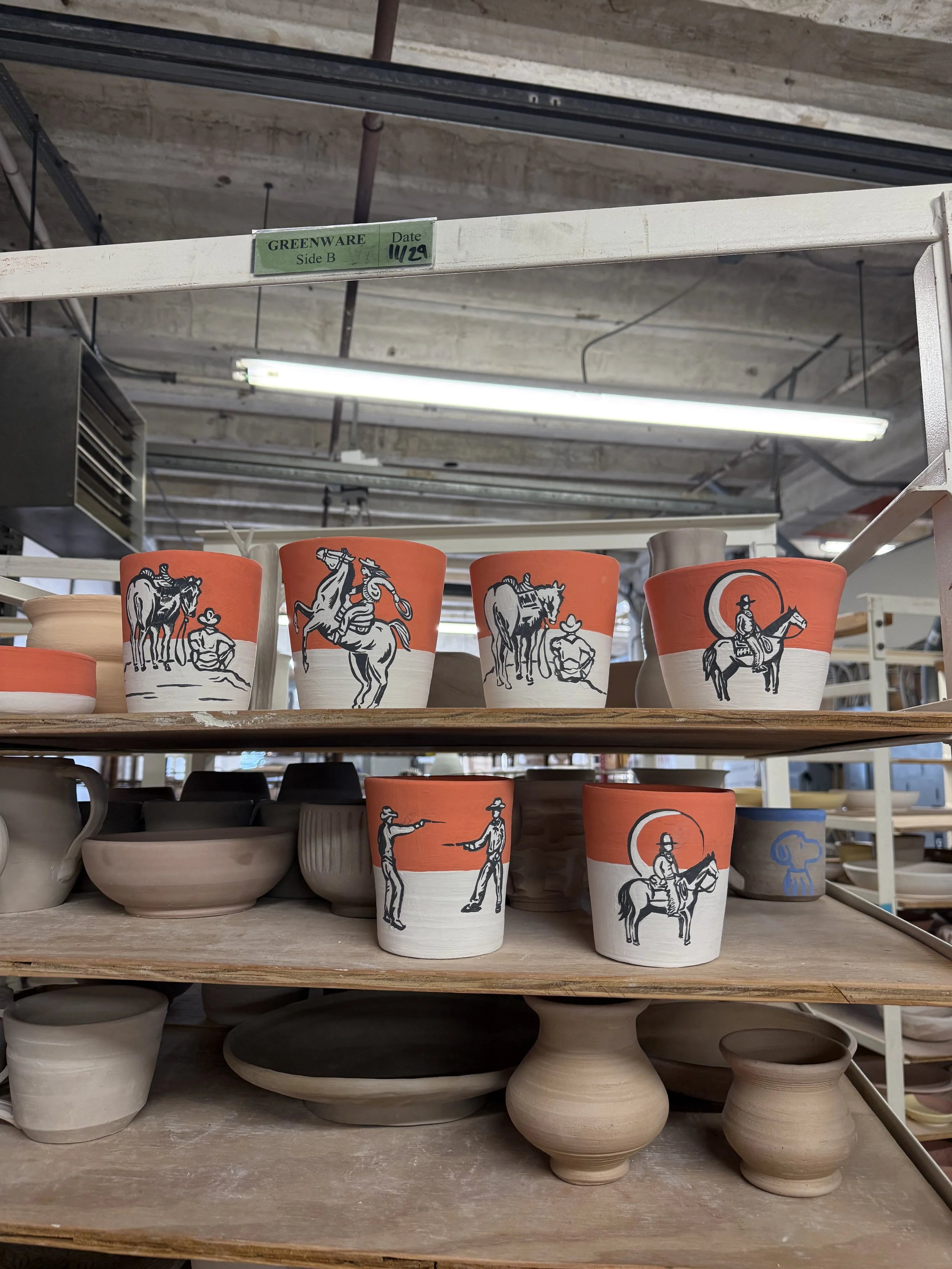 Pottery Cowboy Shooter I $120.00 Cowboy Shooter II $120.00 Rustic Cowboy II $40.00 Rustic Cowgirl I $65.00 Sold Out Rustic Cowgirl II $50.00 Sitting Cowboy I $45.00 Cowboy Moon $40.00 Cowboy Moon II $30.00 Sold Out Western Smoker $40.00 Shooters Cup II $25.00 Kissing Cowgirls $70.00 Dancing Ladies I $35.00 Dancing Ladies II $25.00 Black Mug $25.00 Black Bubble Candle $40.00 Pinch Pot $20.00 Blue Lined Candle $25.00 Blue Lined Mug $25.00 Blue Swirl Dish $20.00 Coral Leaves $25.00 Orange Abstract $25.00 Sold Out Striped Holder $25.00 Abstract Bowl $35.00 Abstract Small Vase $35.00 Abstract Vase $100.00 Green Abstract Bowl $30.00 Leaf Planter $25.00 Grey Carved Cup $20.00 Speckled Cup $25.00 Speckled Bowl $30.00 Cowgirl Cup $30.00 Cowboy Mini $20.00 Cowgirl Rider $60.00 Sold Out Rustic Cowboy I $45.00 Sold Out Sitting Cowboy II $40.00 Sold Out Shooters Mug $35.00 Sold Out Shooter Cup I $30.00 Sold Out Cowboy Rider $90.00 Sold Out Camo Small Vase $30.00 Sold Out Western Collection I $250.00 Sold Out NYT Newspaper $200.00 Sold Out Oranges $60.00 Sold Out Blue Lines $25.00 Sold Out Speckled Collection $100.00 Sold Out